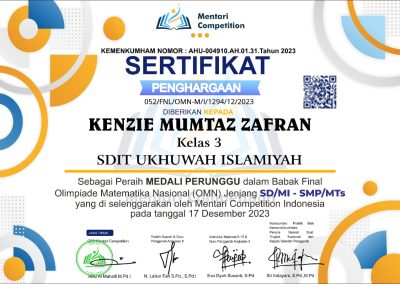 | Peraih Medali Perunggu | Kenzie Mumtaz Zafran | Mentari Competition Indonesia | Nasional | 2023 |
